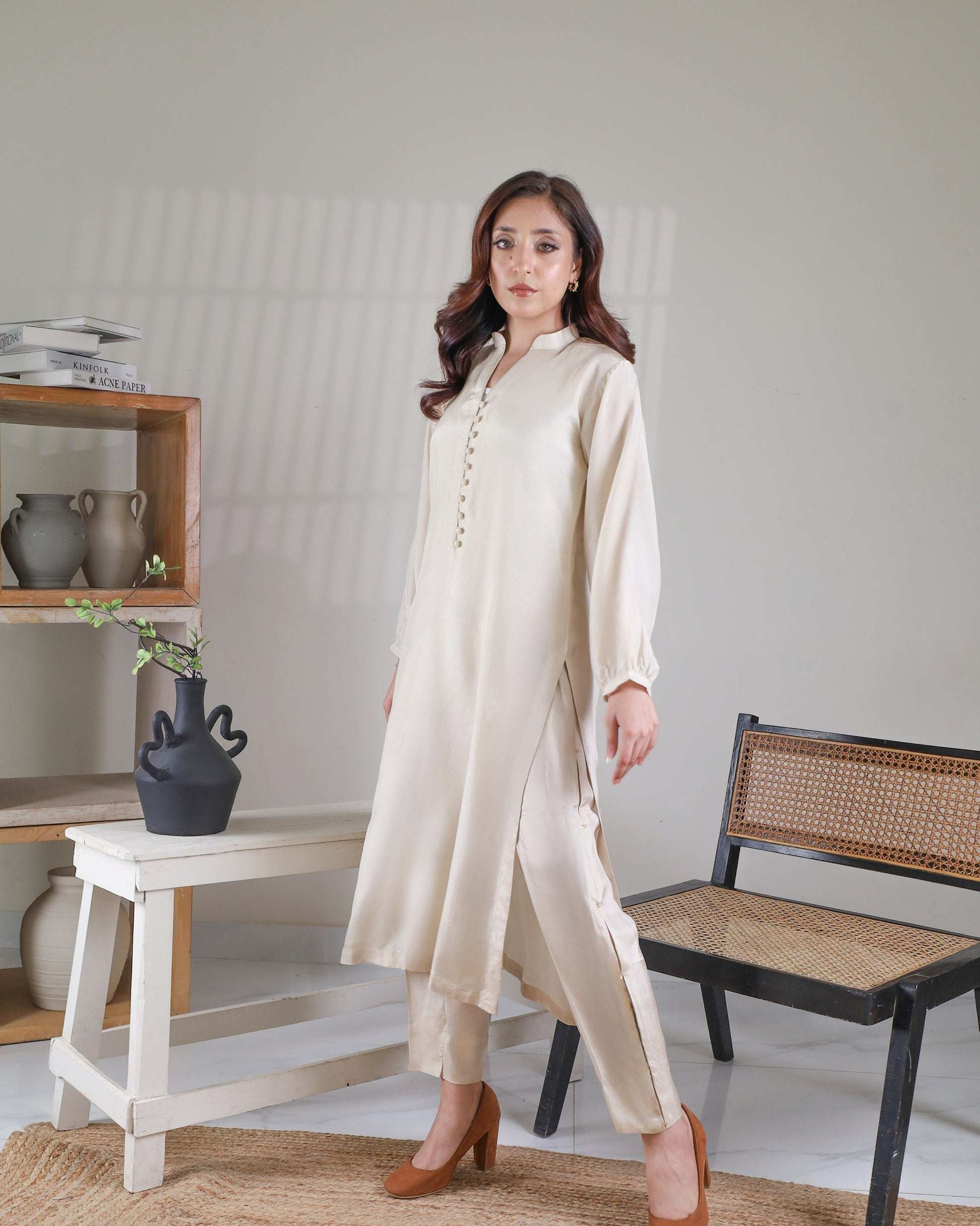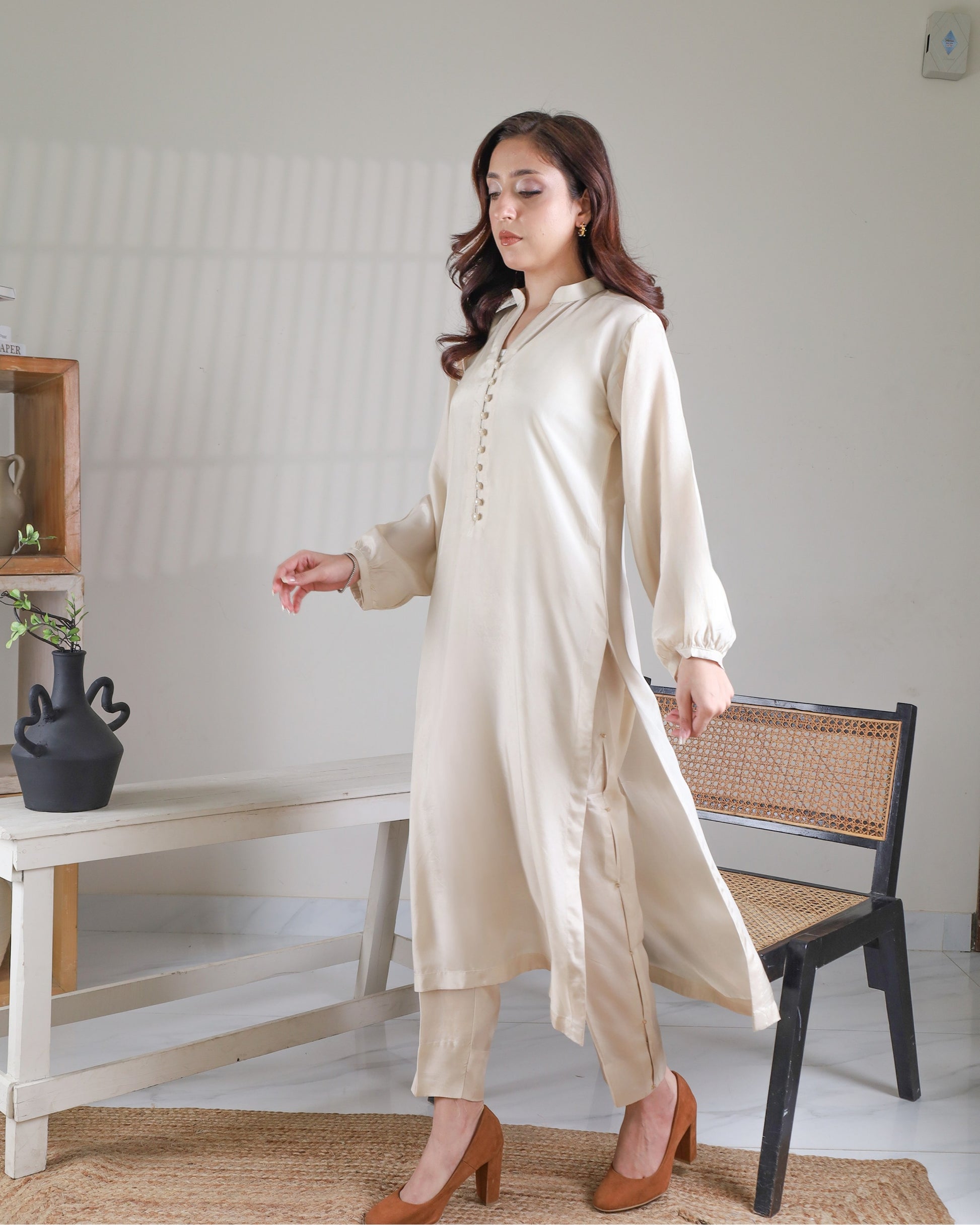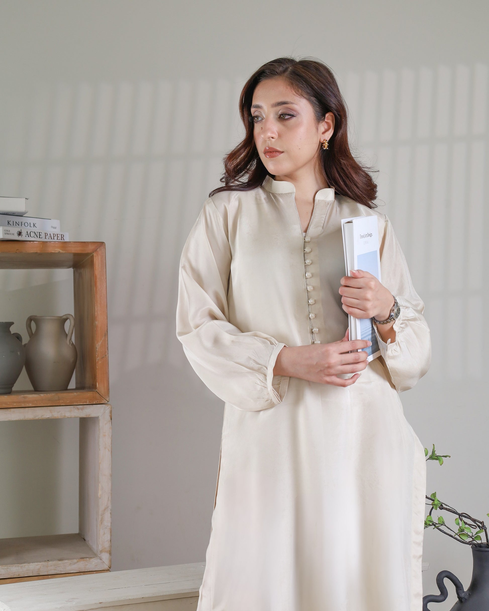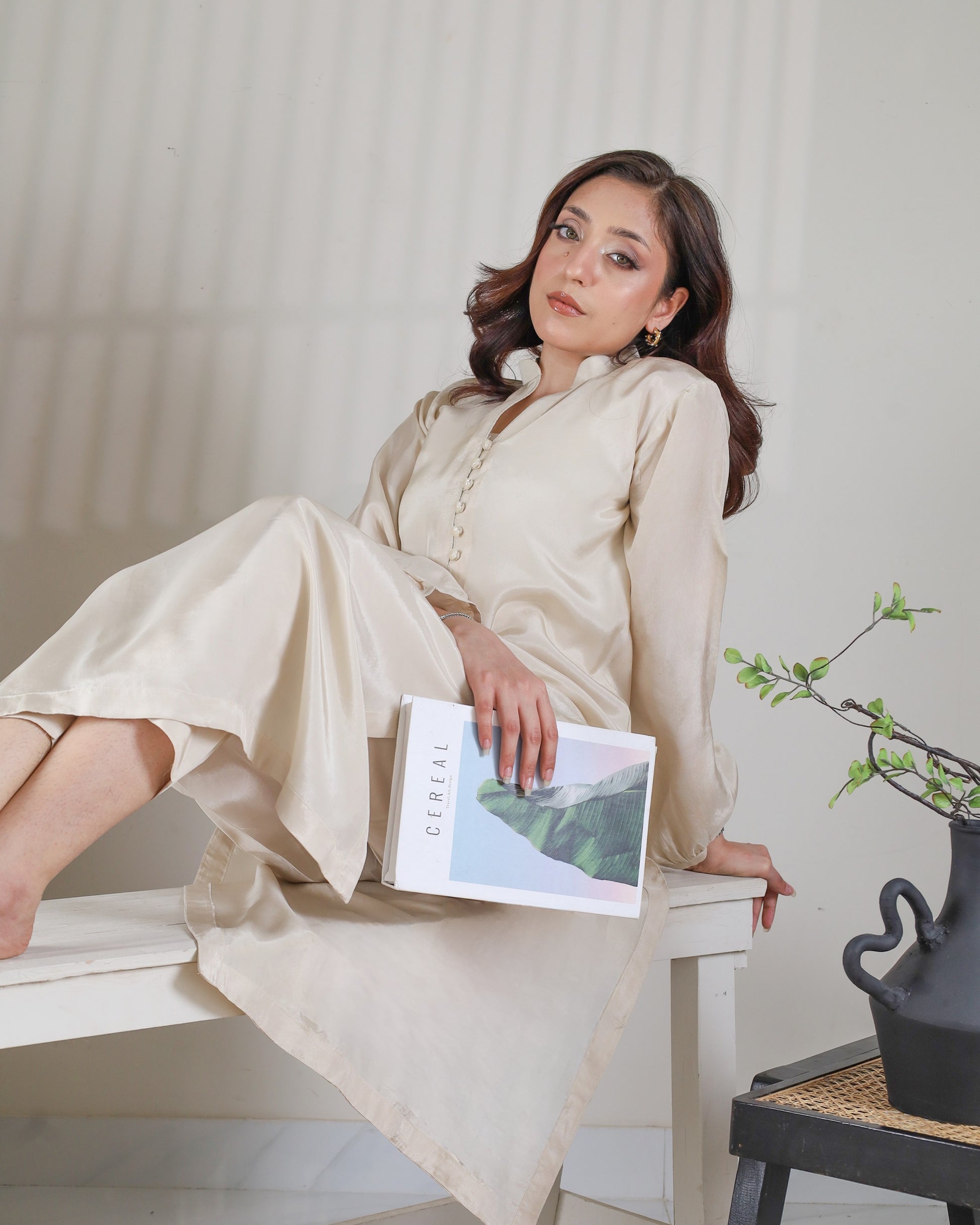 Crafted from smooth Russian silk, Reha features a minimal ivory tone that exudes quiet grace. Soft, flowy, and timeless, made for effortless elegance!