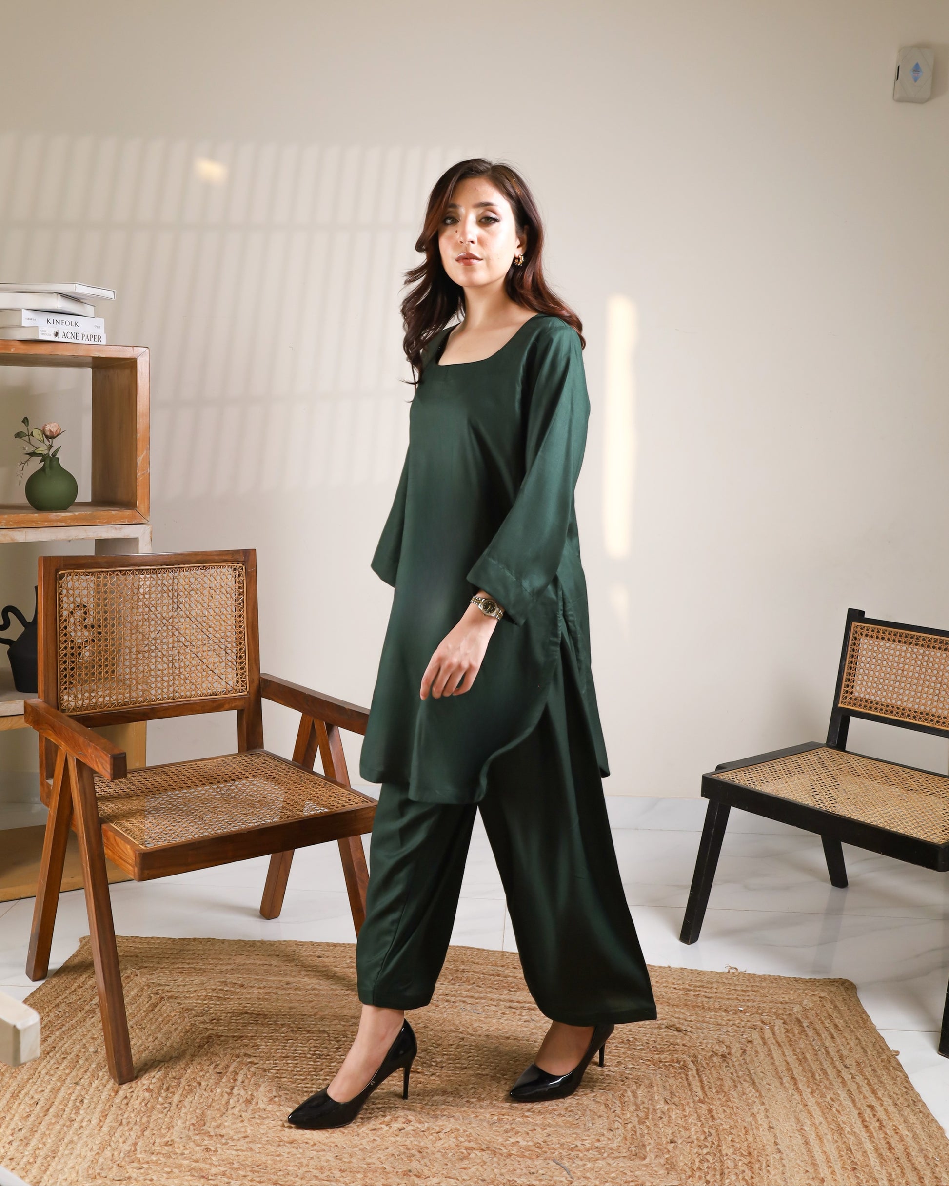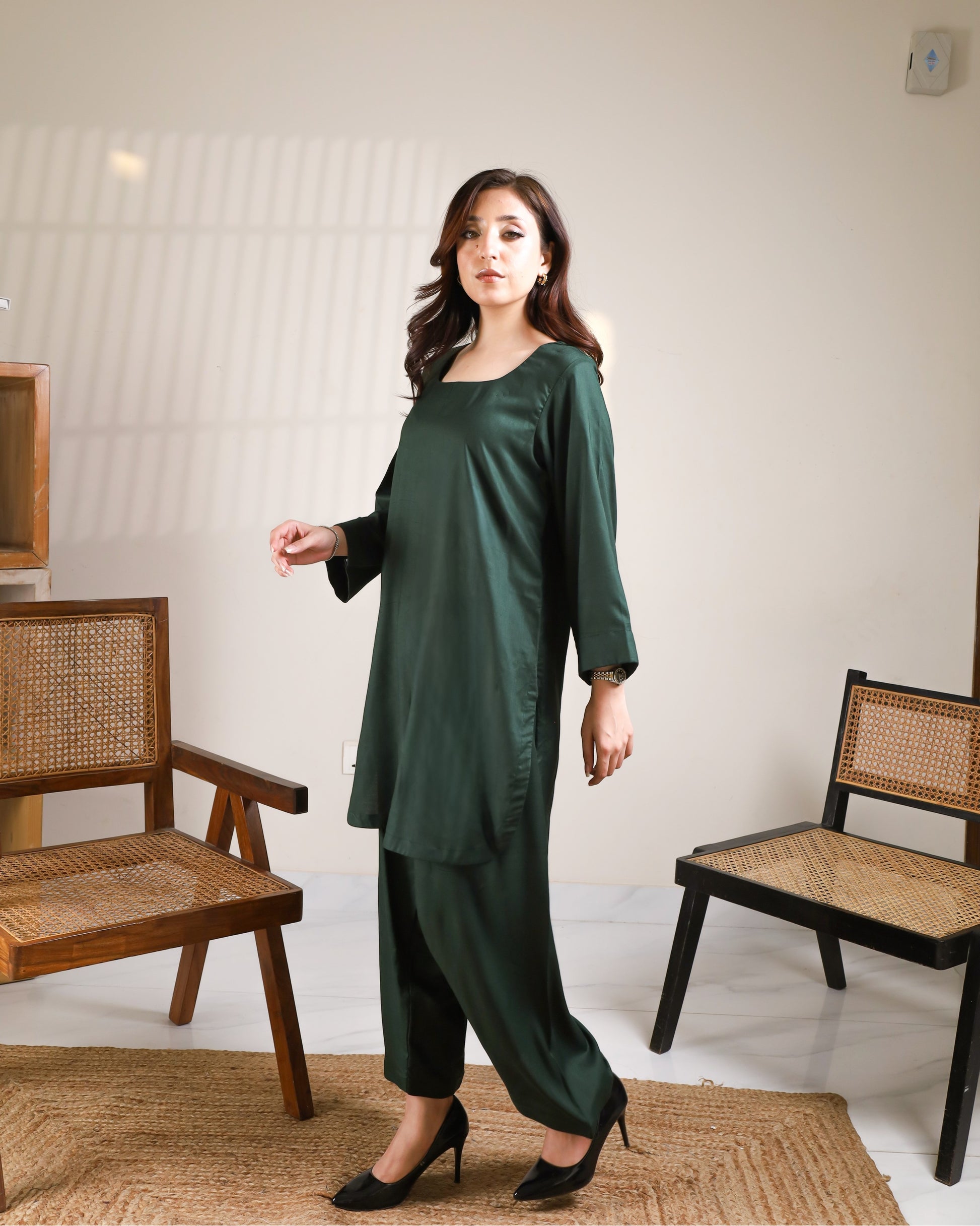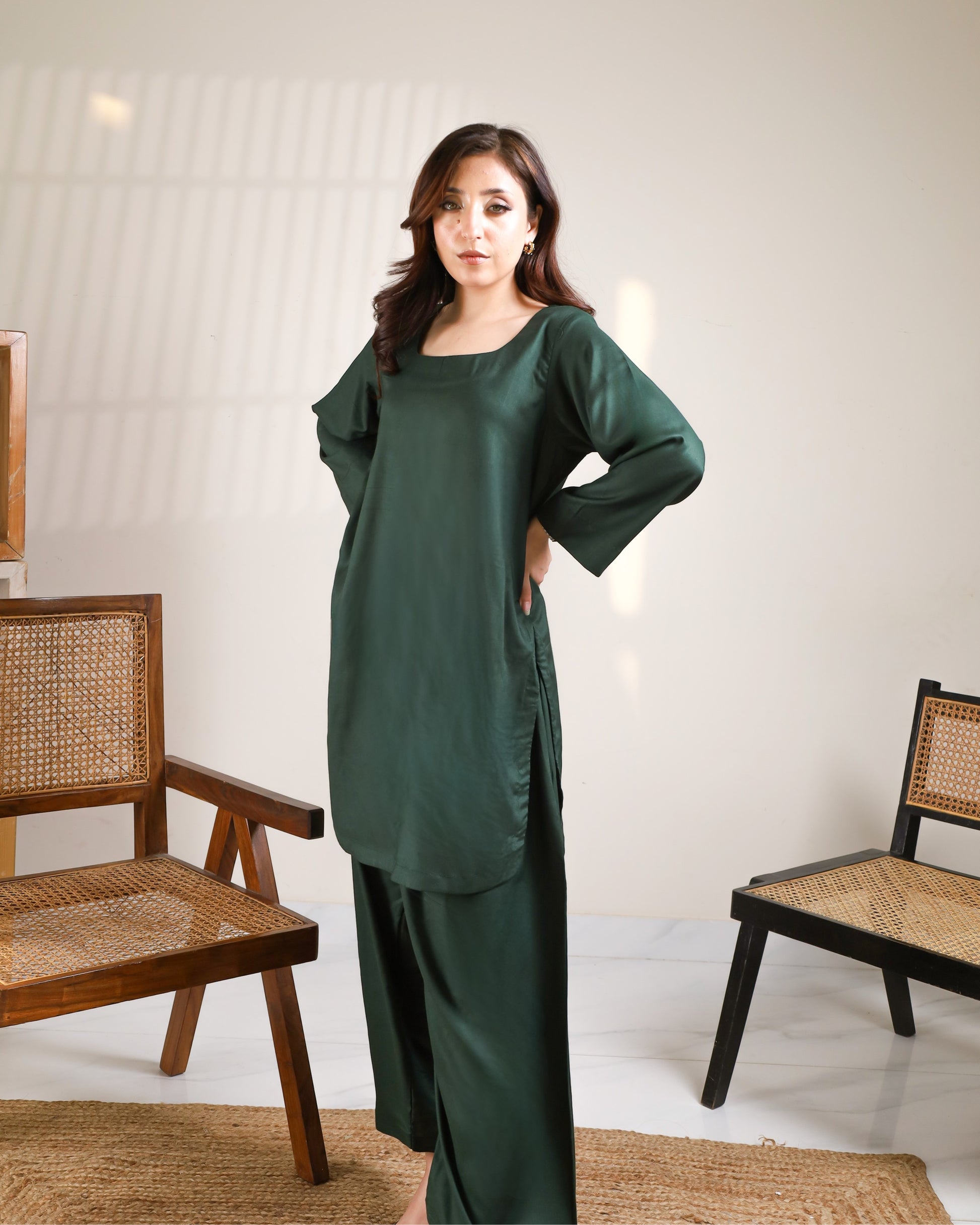 A forest green ensemble in soft linen, defined by its simplicity and quiet elegance. Minimal yet effortlessly chic, it embodies understated charm for days that call for comfort wrapped in style.